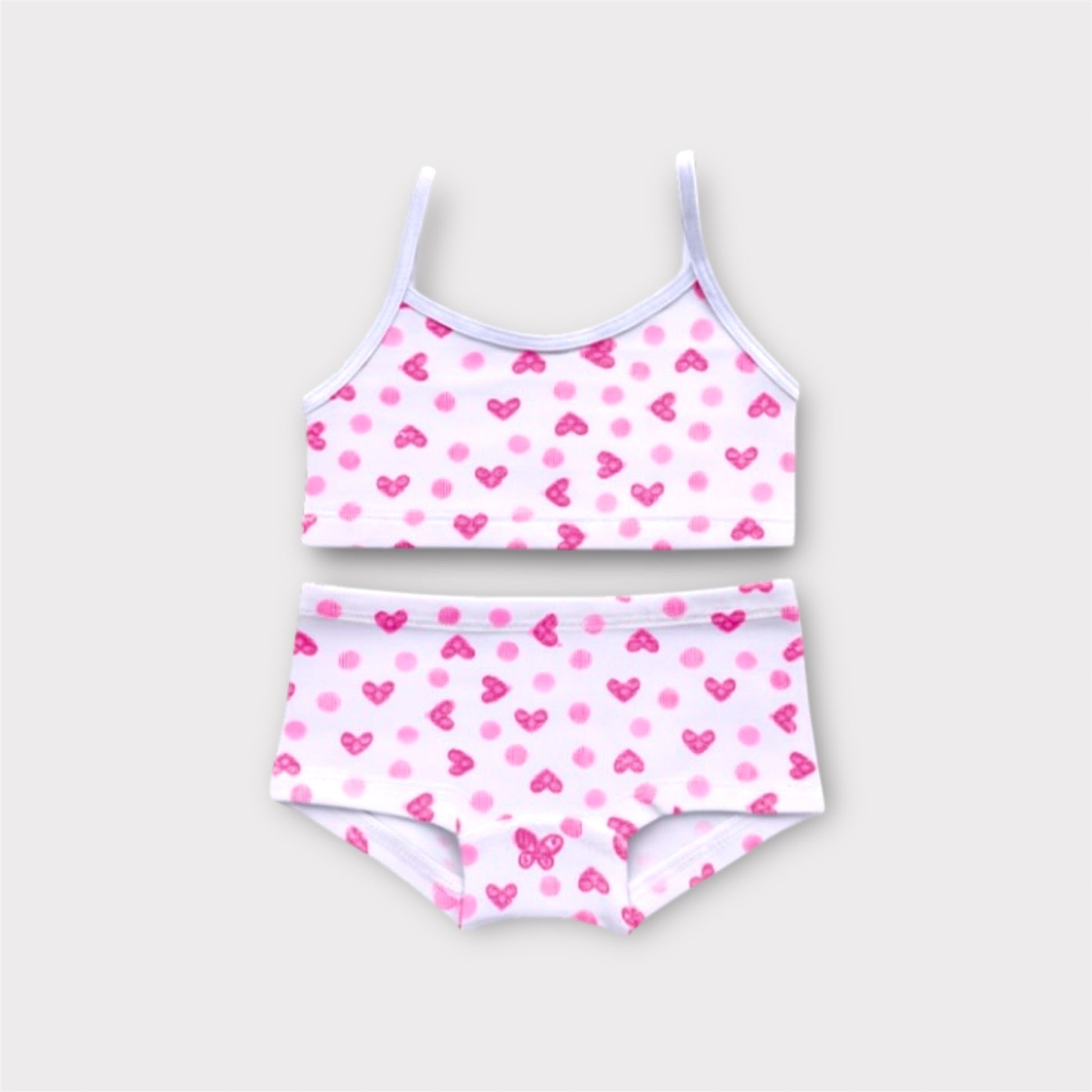 Conjunto para niña en algodón suave y fresco, compuesto por top de tirantes y bóxer a juego en color blanco con estampado. Su diseño tierno y delicado brinda comodidad y ajuste perfecto, ideal para el uso diario.